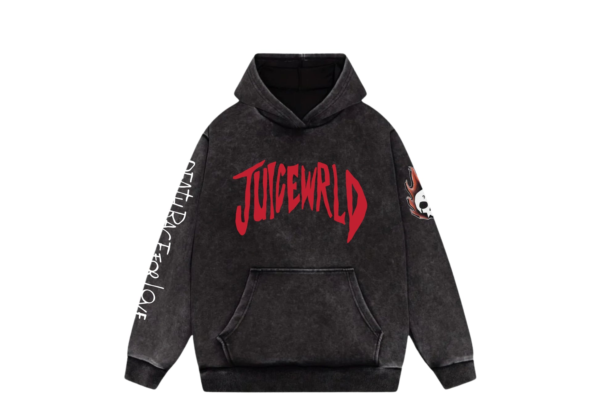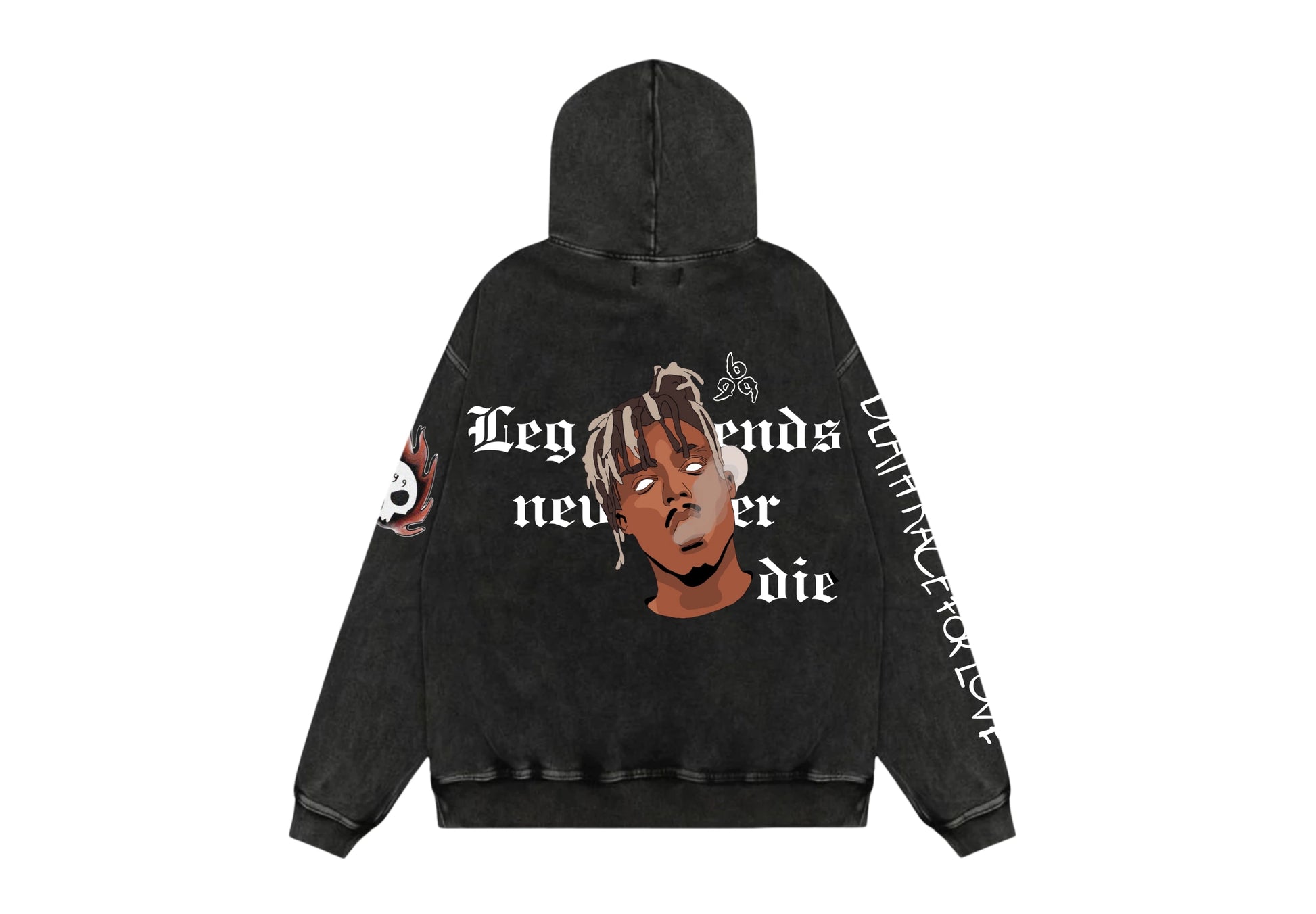 Crafted in vintage black, the Juice WRLD Hoodie features a bold front graphic of the artist with his signature look, surrounded by gothic text reading “Legends Never Die”. The sleeves carry detailed artwork and lettering — “Death Race for Love” and a flame skull patch — symbolizing his eternal fire and legacy.